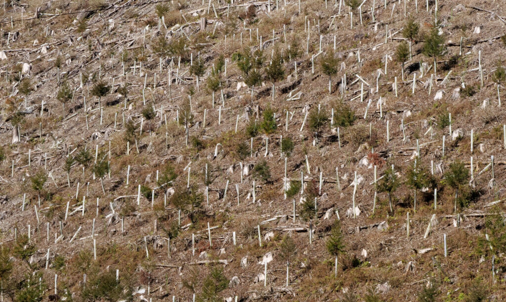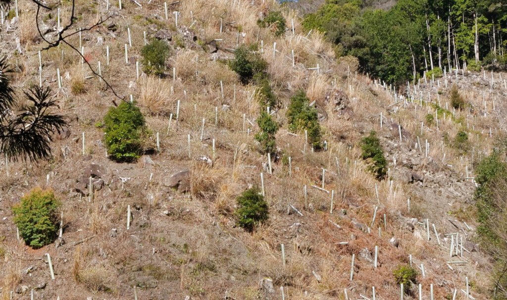皆伐後の山肌に林立する植生保護管。順調に苗が育てば管の上から顔を出す。苗が育っている管は少ない(香美市物部)