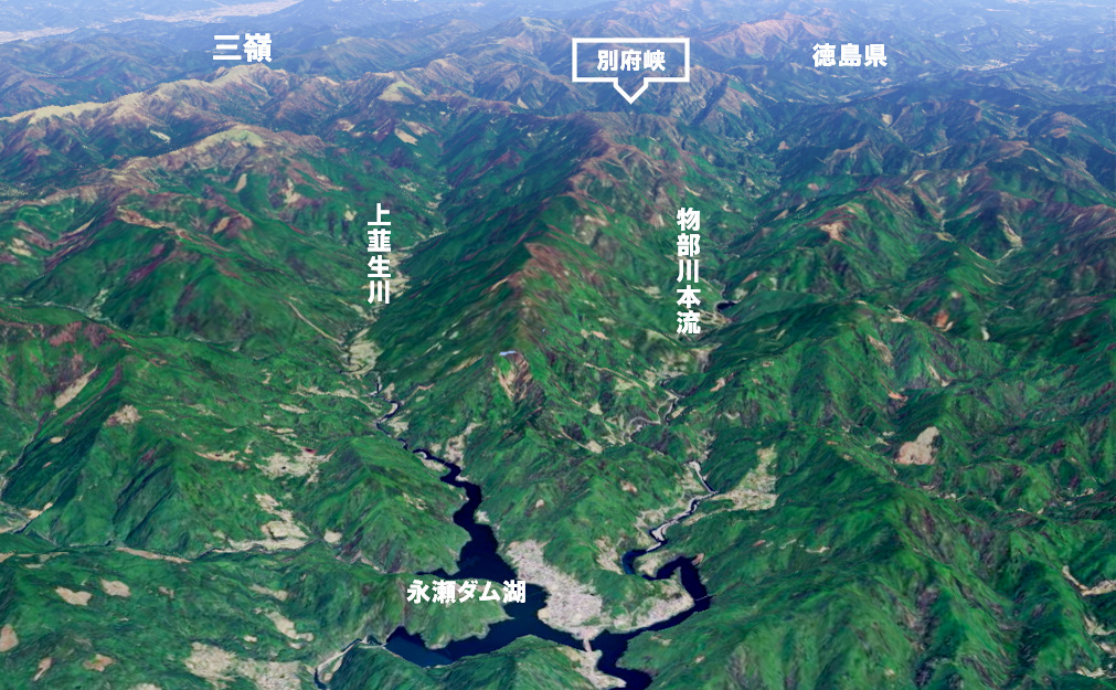 物部川の上流域。三嶺付近から物部川本流と上韮生川とに分かれて流れ下り、永瀬ダムに至る=Google Earthより
