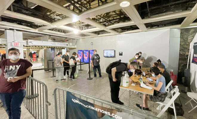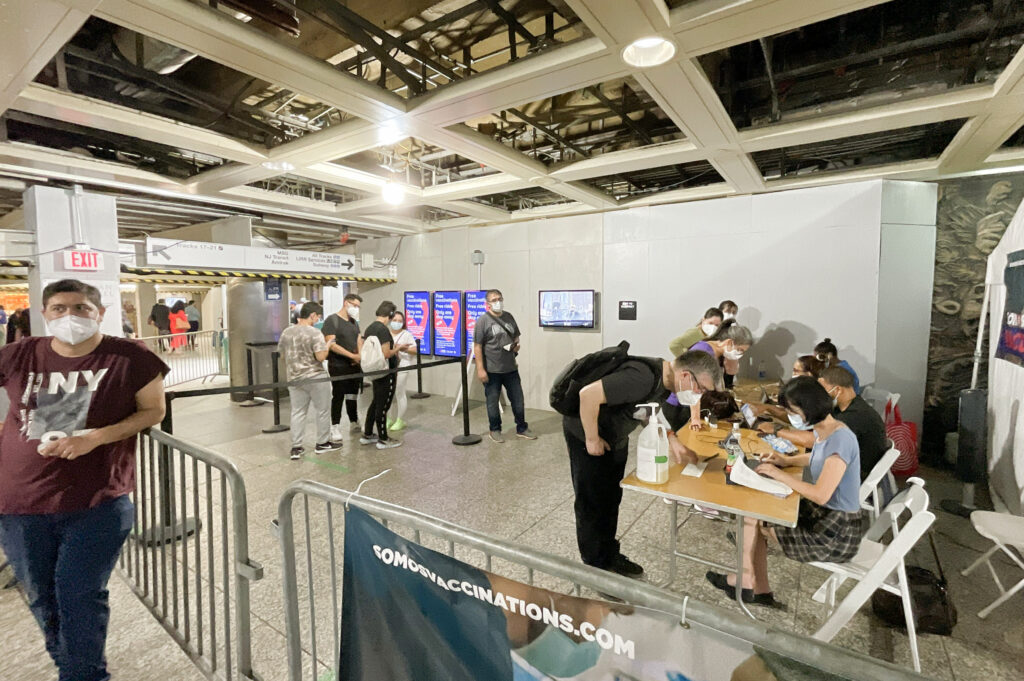 米・ニューヨーク州のペンシルベニア駅地下通路。米国人だけでなく、観光客であってもワクチンをその場で接種できる。ワクチン接種の証明書も発行され、接種者には地下鉄乗り放題のカードも提供された。感染拡大抑止と観光経済を両立させる試みだ=2021年夏、七尾和晃撮影