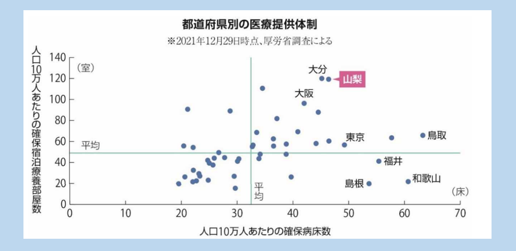 「山梨県の新型コロナ対応の検証・記録業務に関する報告書」にある都道府県別の医療提供体制(2021年12月29日時点)。この時点で高知県は10万人当たり確保病床数36.6、確保宿泊療養部屋数55.7だった