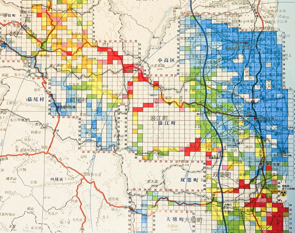 「とどけ鳥」のマップは年間放射線量が20㍉シーベルトを超える場所を赤、5.3㍉シーベルトから10.5㍉シーベルトの場所を黄色で表している。「放射線管理区域」のラインを超えるエリアはまだまだ広い。