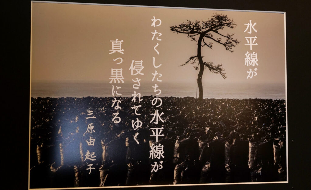 アートを切り口としているだけに、「伝承館」にはさまざまな表現が集積している。放射線汚染土を詰めた黒いフレコンバッグの山を撮った写真には、白字で短歌を書き入れていた。歌の主は1979年生まれの歌人、三原由起子さん。「ふるさとは 小分けにされて 真っ黒な 袋の中で 燃やされるのを待つ」「水平線が わたくしたちの 水平線が 侵されてゆく 真っ黒になる」。事故前の美しい風景に墨で点々と汚れをつけた写真もある。