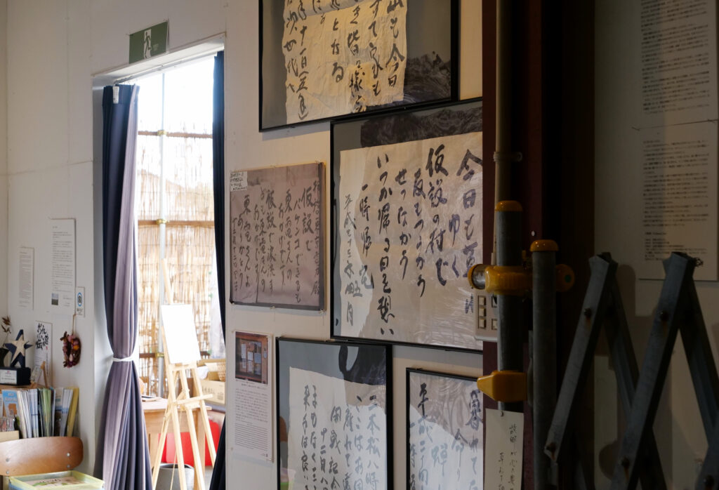 壁の何カ所かでは筆文字が存在感を放っている。「今日も暮れゆく仮設の村で 友もつらかろ せつなかろ いつか帰る日を想い」「放射能体験ツアー大募集中 東電セシウム観光」など、黄ばんだ紙に悲しみや恨みの伝わる文言がたくさん並ぶ。添えられた説明文によると、筆者は浪江町津島に住んでいた今野洋一さん。避難した直後から外界に向けて自宅の窓に貼り、一時帰宅したときに貼り足していた。帰還困難区域内だったその自宅はのちに解体され、今野さんは避難先で亡くなった。今野さんの思いを伝えようと、貼り紙は「伝承館」が譲り受けた。