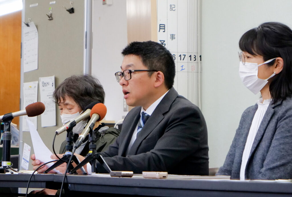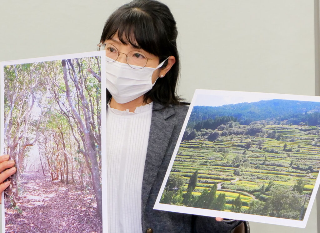 会見で強調したのは環境への影響だ。風車の高さは144㍍に達する。「45階建てのビルが回っているのと同じ。自然環境への影響は計り知れない」と加藤代表。隣に座る猪股史事務局長は「美しい棚田が広がる吉延地区で祖父母から引き継いで田んぼを作っている。国見山で生まれた水が吉延の田んぼを守っている」として、水源かん養林を守る必要性を訴えた。住民の不安材料は湧き水や地下水の減少、地すべり災害の危険、低周波公害、渡り鳥を始めとする動物への影響など多岐にわたる。加藤代表は工事に伴う盛土の危険性にも言及した上で、「県は保安林の伐採許可を出さないでほしい」と強く訴えた。現在、「防災」名目で作業道工事が行われていることにも不信感を示し、「(この大規模風力発電事業が)なぜ影響がないと言えるのか、事業者側にぜひ説明をしてほしい」と呼び掛けた。