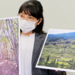 計画地に広がる水源かん養林の写真と吉延の棚田の写真とを掲げ、大規模風力発電によって森林が伐採される影響を説明する「高知・本山の風力発電と暮らしを考える会」の猪股史さん=高知県庁2階の県政記者室