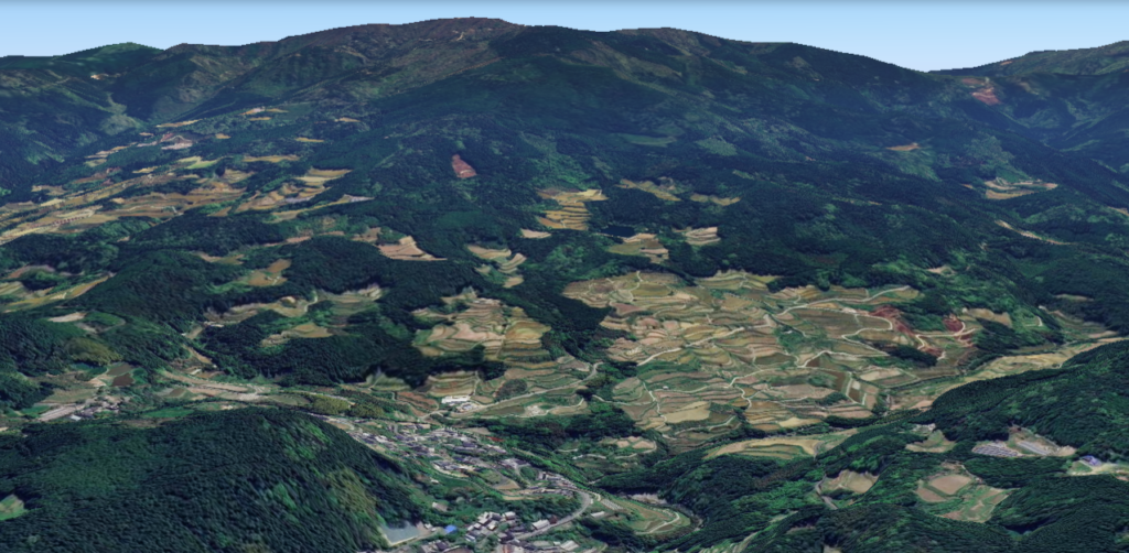 国見山の尾根筋を北方の本山町方面から見る。後方の尾根に高さ144メートルの巨大風車が並ぶ。右に広がる棚田が吉延地区。この棚田でできるコメのおいしさは全国的に高く評価されている=Google Earthより