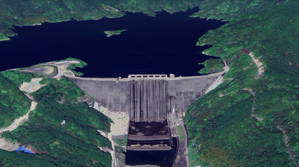 高知県土佐町と本山町にまたがる四国最大の早明浦ダム。「四国のいのち」と形容される=Google Earthより