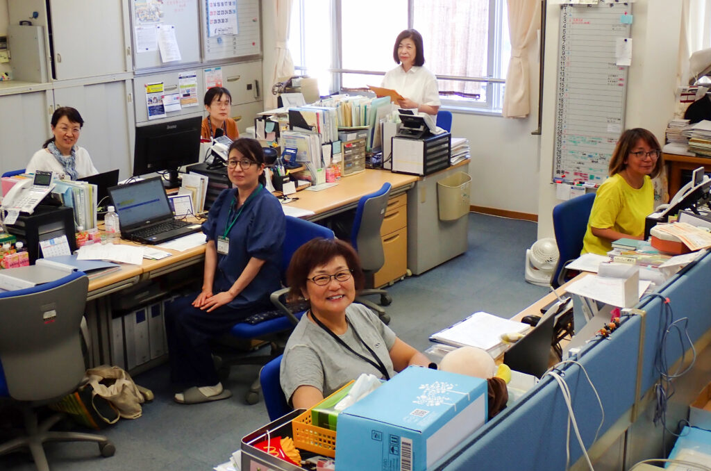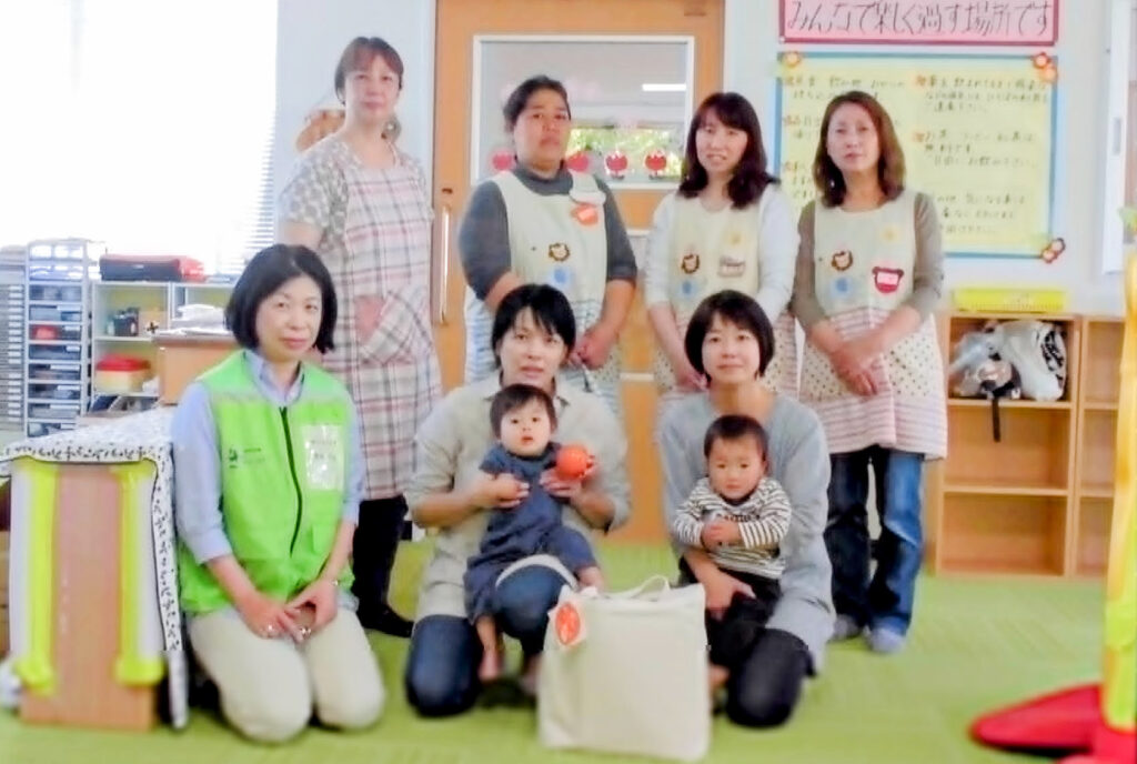 「はままつ子育てネットワーク ぴっぴ」のスタッフと原田さん(中央奥)=2025年7月27日、静岡県浜松市