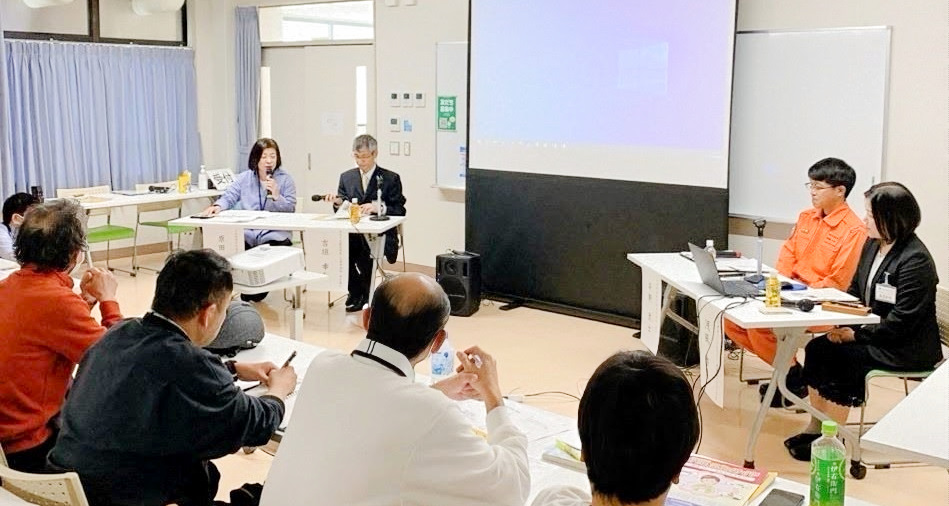 能登半島地震の被災地、珠洲市の支援に入った浜松市の保健師、消防士、危機管理課職員に話を聴く原田さん(壇上左端)=2024年4月20日、浜松市防災学習センター