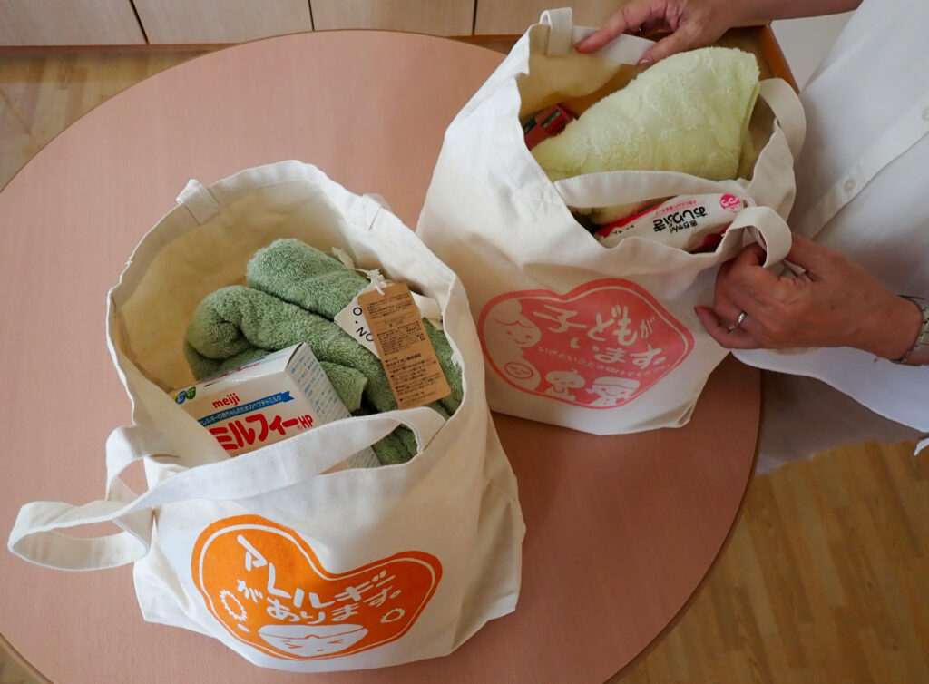 「つながる支援パック」。乳幼児、アレルギーのある子に必要な食品、用品をひとまとめで手渡せる
