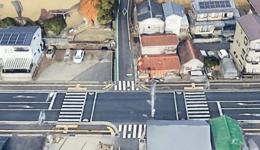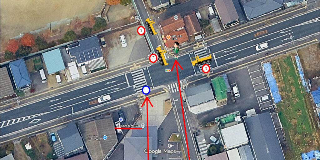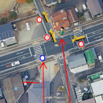 現場の位置関係。児童は上方の小さな横断歩道を右から左に渡り、右折して小道を上方に登校していこうとした=Google Earthより