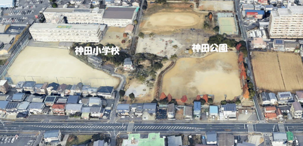 児童らは右下の交差点から小道を上方に進み、神田公園の中央を左に歩いて神田小に向かう=Google Earthより