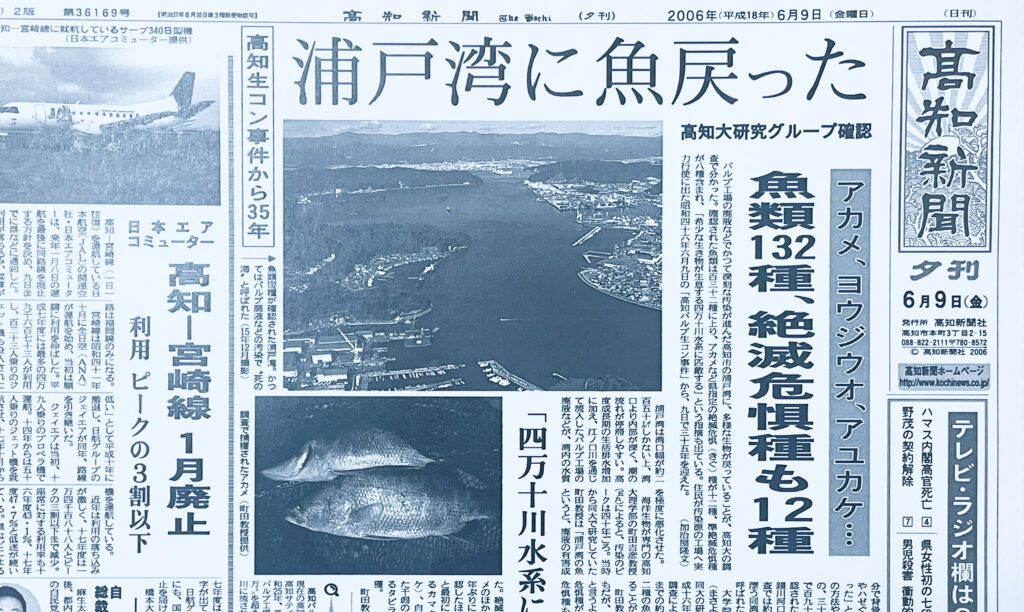 2006年6月9日、生コン事件から35年の夕刊に「浦戸湾に魚が戻った」と報じる高知新聞の1面記事。この時点で132種の魚類が確認されていた