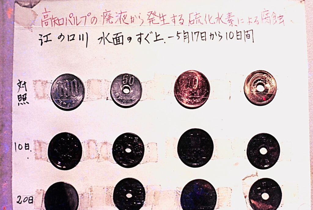江ノ口川の川面近くに下げた硬貨の変色実験。硫化水素によって黒色に変わっていった=田中正晴さんの資料より