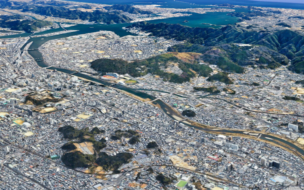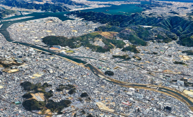 高知市街。写真の右下端に高知パルプの工場があった。廃水は江ノ口川という小河川を伝って中心市街地を流れ下り、上方右手の浦戸湾へと流れ込んだ。写真に写っている大きな川は鏡川=Google Earthより