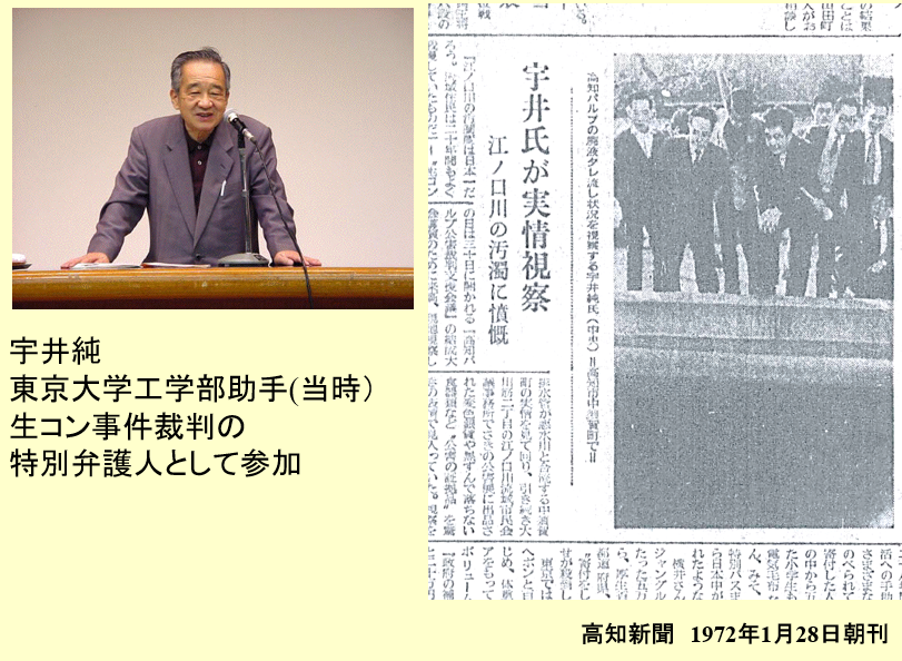 〈年配の高知県民は、1971年6月9日の「高知パルプ生コン事件」をよもや忘れた訳ではあるまい。戦後間もない1950年から、高知市の中央部を貫流する浦戸湾流入河川の一つである江の口川に、一日あたり13500トンという信じがたい量のパルプ廃液が垂れ流し状態だった。この文庫の最初で紹介したが、私が高知大学に入学した1965年当時、高知駅に降り立つとドブの匂いが漂い、風向き次第では吐き気をもよおすほどだった。川の水全体がどす黒く、ヘドロの深さを測るのも躊躇されるほどであった。川沿いの民家は窓を開けることすらできず、それでも金属の食器がたちまち変色したという。パルプ廃液が流れ込む浦戸湾は、そのころ全国で最悪の海だった。奇形魚が続出し、潰瘍で鱗がはげ落ちて皮膚がただれ、出血した痛々しい魚が山ほどいた。地域の住民と自然は、地域の経済のなすがままだった。そこで、郷土を愛し、その象徴である浦戸湾をこよなく愛する市民がパルプ廃液の排出孔を生コンで塞ぐという実力行使に出たのである。当時、私は大学院生で、福岡で暮らしていたが、衝撃的なニュースだった〉