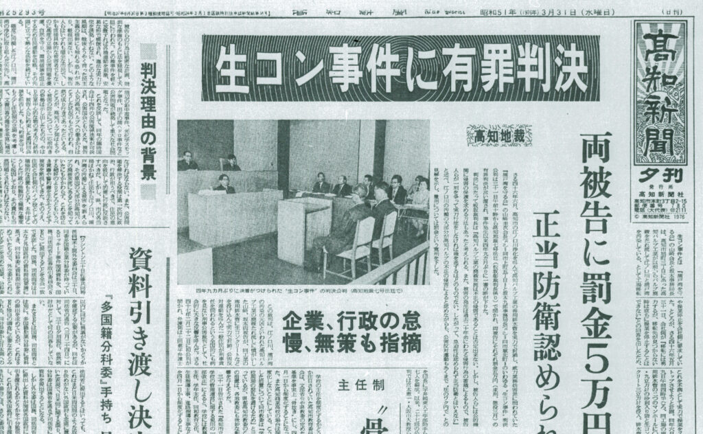 高知パルプの元従業員をめぐる問題が決着したことで、残る焦点は裁判の行方になった。事件半年後の1971年12月に「浦戸湾を守る会」の山崎圭次会長、坂本九郎事務局長が起訴されたあと、翌1972年2月から高知地方裁判所で29回の公判が続いた。公判の中で明らかになったのは、公害のひどさと、地元と結んだ協定を高知パルプやその前身の会社(いずれも大王製紙系)が全くと言っていいほど守っていなかったことだ。加えて元従業員は次々と高知パルプの秘密を暴露した。使ってはいけない古い窯を秘かに使用して生産増を図っていたこと、つまり吐き出す廃液量をこっそり増やしていたこと、外部から検査が入るときだけ窯に封をしていたこと、日誌を書き換えていたこと…。被告は住民側のはずなのに、高知パルプ側が追い詰められていく。住民側の弁護団は正当防衛論を展開した。企業が違法行為で住民に襲い掛かるとき、正当防衛は認められるのだ、と。判決が出たのは1976(昭和51)年3月31日だった。