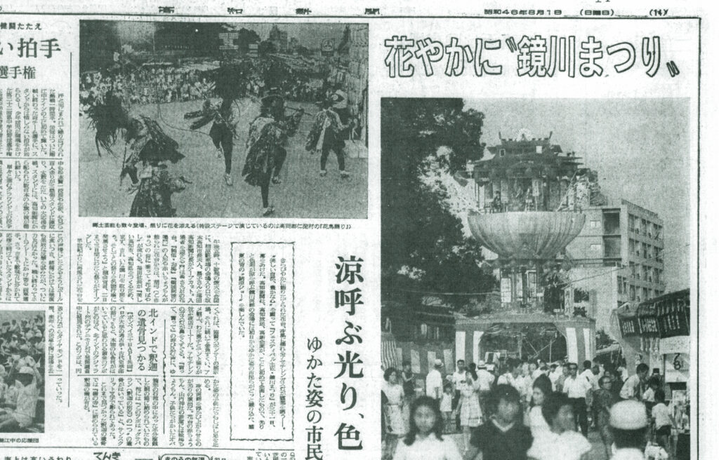 第一回の「フェスティバル土佐・鏡川まつり」を報じる1971年8月1日の高知新聞。高知市の人口(当時約24万人)を上回る入場者を呼ぶイベントとして大成功し、市民の目を鏡川に向けた