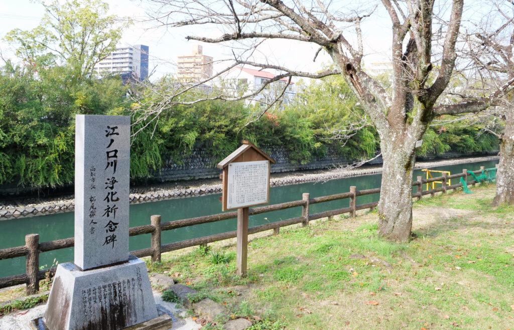 城西公園西端、江ノ口川のほとりにある「江ノ口川浄化祈念碑」。説明板には「生コン事件」も「高知パルプ」も書かれていないが、台座には特別発起人として「浦戸湾を守る会」や山崎圭次さんの二男・山崎道生さんの名が刻まれている