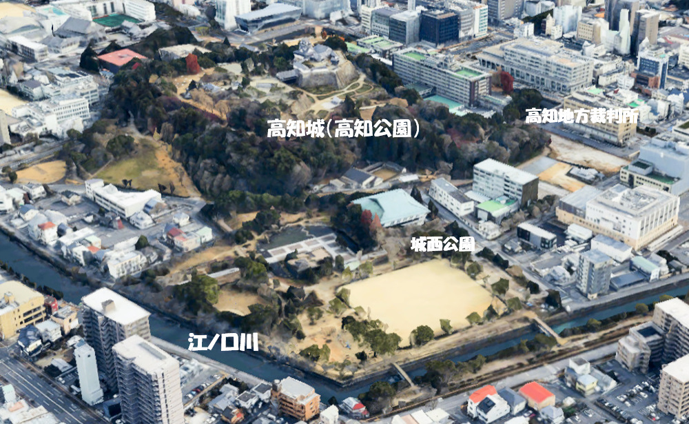 Google Earthで見た今の高知城と江ノ口川。終戦直後までの清流・江ノ口川は高知市のシンボルでもあった