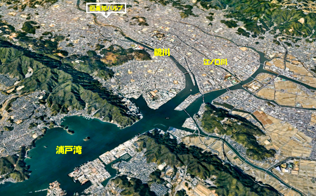 Google Earthで見た現在の高知市。1972年5月まで、市街西部の高知パルプから高濃度の有機物と亜硫酸廃液が江ノ口川を通じて浦戸湾へ流れ込んでいた