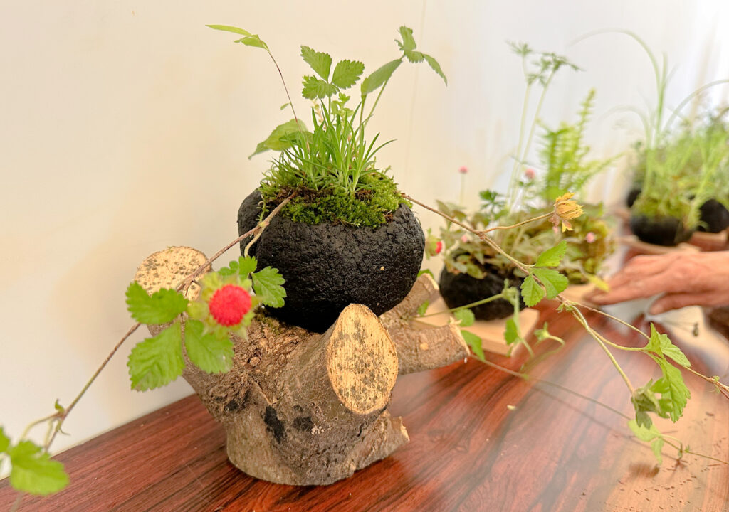 筆者も過去に炭鉢の植え込み体験に参加したことがあるが、日常に存在する植物に注目し、土や苔の感触を味わいながら植え込むのはとても新鮮で、面白かった。この展示会の参加者たちも同様に、明るい気持ちで炭鉢植え込みをつくっているのだろう。