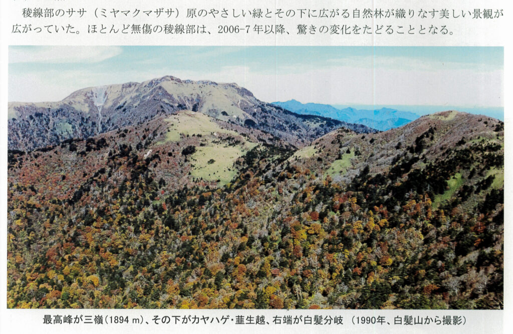 〈三嶺が激特被害期以降に失った自然の価値は莫大なものになろう。我々が知る限り、食害前の三嶺の森は貴重な自然であったし、2000年代初期までは水土保全機能面でもどんな豪雨でも受け止める“盤石の森”であった〉
