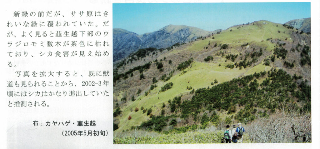 食害に遭い始めたころ。2005年のカヤハゲと韮生越=『シカ食害で悩む三嶺の森』より