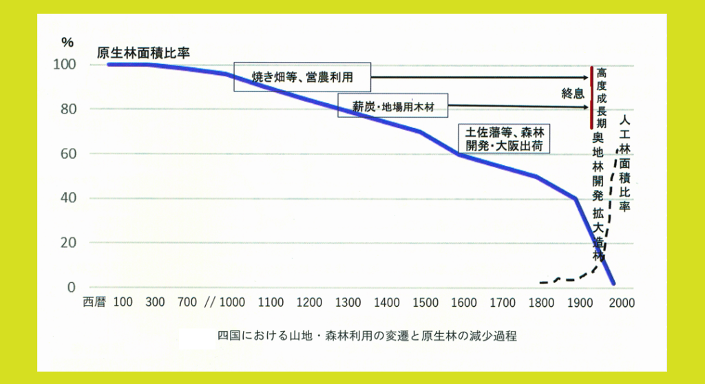 四国の原生林の減少過程=『危機に立つ四国山地の自然』(三嶺の森をまもるみんなの会)より