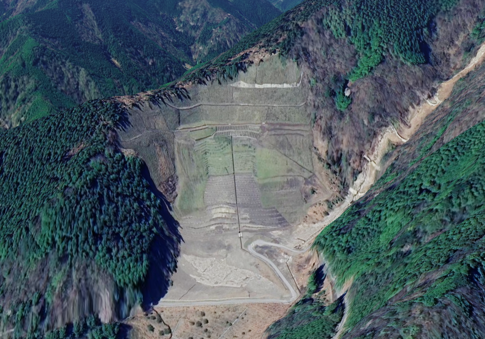 香美市物部、中尾地区の深層崩壊現場。既に治山工事は終了している=Google Earthより
