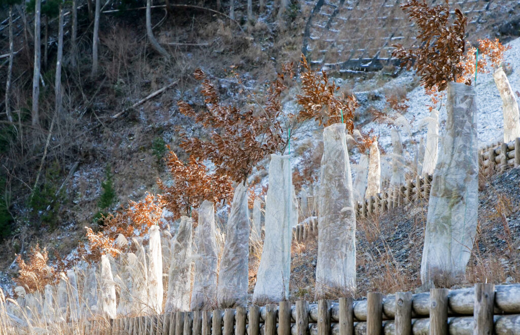 治山工事後の崩壊地を歩く。と、依光さんが歩を止めた。円筒形のビニールに入った小さな木が並んでいる。「植林したあと、シカに食べられないようにしたんですね」。多くの場合、高知県の山々では皆伐したあとにスギやヒノキを植林する。ところがシカが増えすぎたため、シカの群れが片端から新芽や葉を食べてしまう。やがてスギやヒノキの苗は枯れ、植林に失敗した山肌が残る。