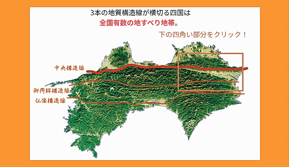 厄介なことに、高知県は物部川上流から高知市を通って檮原方面にまで仏像構造線が通っている。そればかりではなく御荷鉾構造線(三波川帯南縁~秩父帯北縁付近の境界域にある断層・構造線群)も、嶺北地域から仁淀川町にかけて通っている。仏像構造線と同じく、御荷鉾構造線も破砕帯を伴っている。