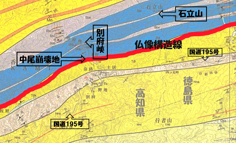 産総研の5万分の1地質図に地名などを書き入れた。赤い線が仏像構造線。中尾の崩壊地は仏像構造線上だった