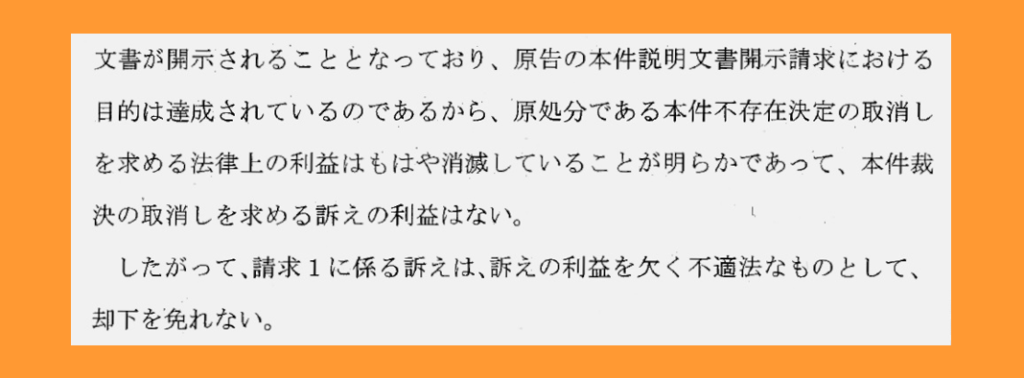 判決から。原告の目的は文書の開示だったはず。裁決によって文書は開示されているので、裁決を取り消す訴えの利益はない。という論法によって門前払いされた