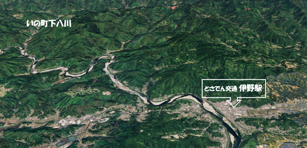 旧伊野町中心部にある路面電車の伊野駅と、仁淀川上流の下八川=Google Earthより