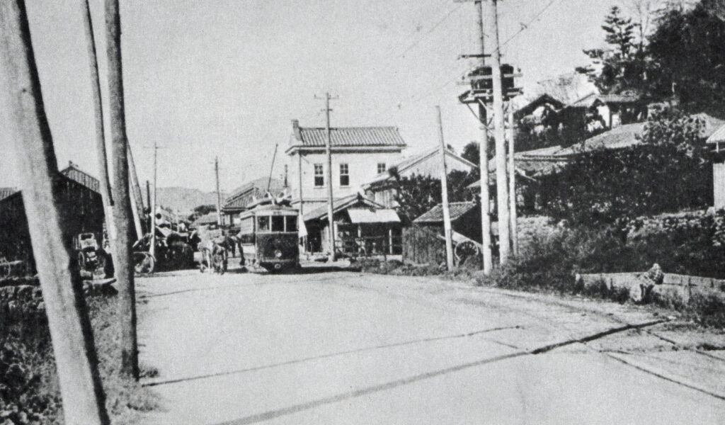 昭和初期の伊野新町(現いの町新町付近)。土電の電車が走っている=『土佐電鉄75年の歩み』より