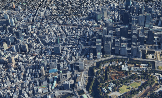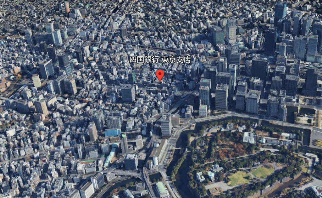 四国銀行東京支店のある辺りを西から望む。右のビル街は丸の内と大手町。右下が皇居=Google Earthより