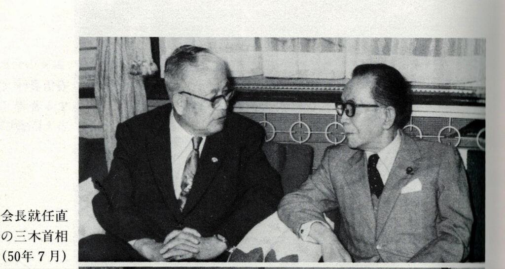 1975(昭和50)年7月、全中会長として三木武夫首相と話し合う藤田三郎氏(左)=『耕す心』(高知新聞社)より