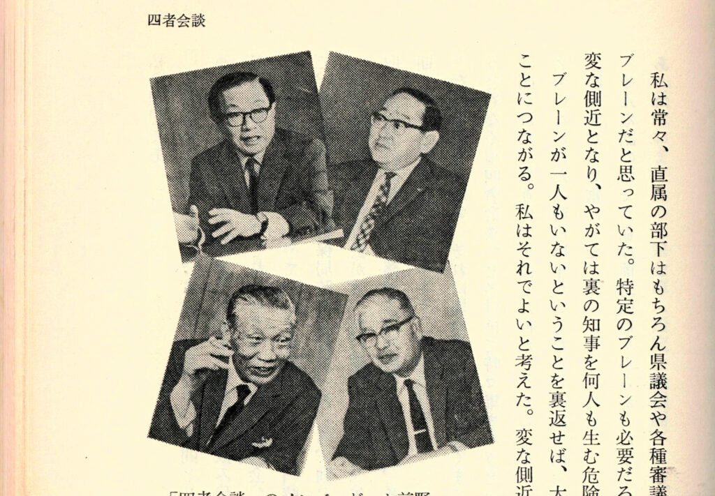 溝渕増巳氏は「4者会談」と呼び、自著の『県政二十年』にはそのスタートを〈確か昭和四十二年ごろ〉と書いている。左上から時計回りに福田義郎氏、前野直定氏、藤田三郎氏、溝渕増巳氏=『県政二十年』より