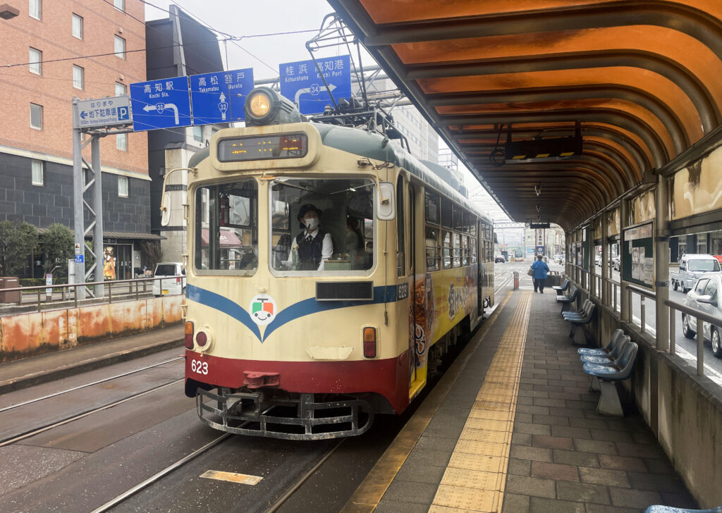 土電の後継、とさでん交通の電車=2026年3月、はりまや橋電停で