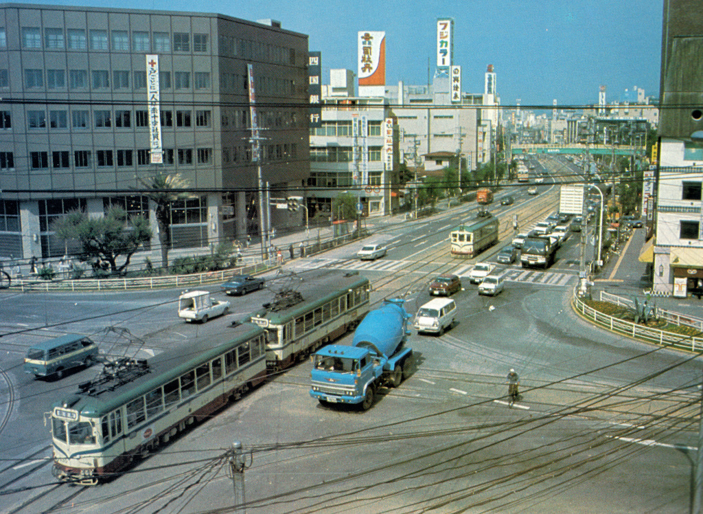 1979(昭和54)年当時のはりまや橋交差点。当時は2両編成の電車も走っていた。後方左は四国銀行本店=『土佐電鉄75年の歩み』より