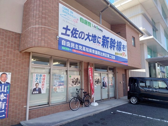 「土佐の大地に新幹線を!」を掲げた自民党事務所=2024年、高知市桟橋通3丁目