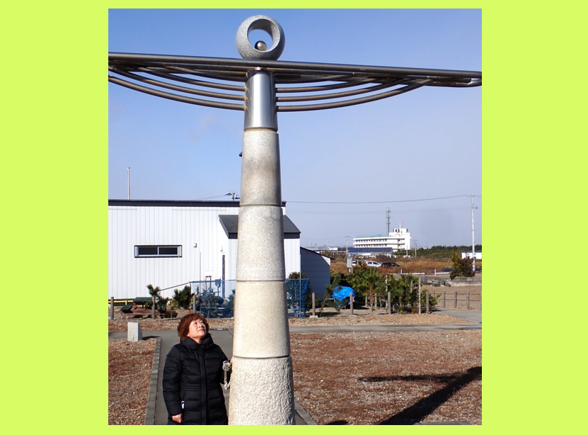 慰霊の場所近くにある「荒浜記憶の鐘」の傍らに立つ理恵さん。克倫さんは、ここで最後の住民救出をした。右後方に荒浜小が見える=2025年12月、仙台市若林区荒浜