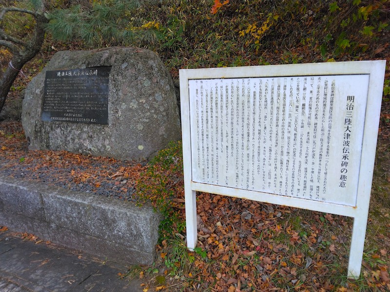 大船渡市綾里に残る明治三陸大津波伝承碑。道合というこの場所は、2方向からの津波がぶつかった地点といわれる